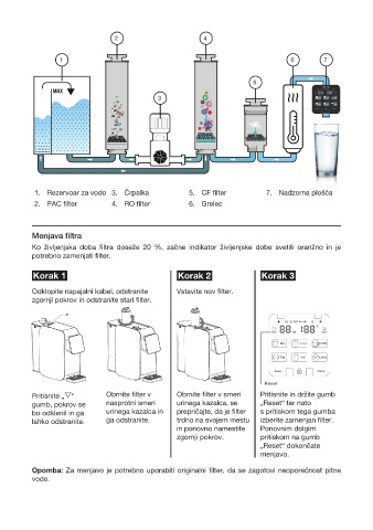1. Rezervoar za vodo 3. Črpalka 5. CF filter 7. Nadzorna plošča
